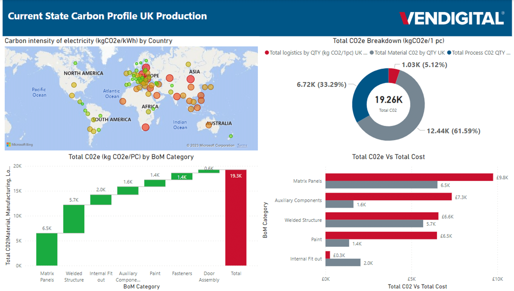From this analysis, Vendigital created a carbon baseline dashboard which displayed the data using a number of bespoke metrics, such as carbon intensity by material. This allowed us to examine and impact the design for the future ensuring that the embedded carbon were factored into all engineering, manufacturing and supply-chain chain decisions.